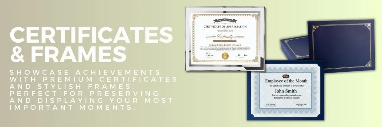 Explore our premium selection of certificates and frames, perfect for showcasing achievements, awards, and recognitions. Our customizable certificates are designed to make a lasting impression, while our stylish frames offer the ideal way to preserve and display them with pride.